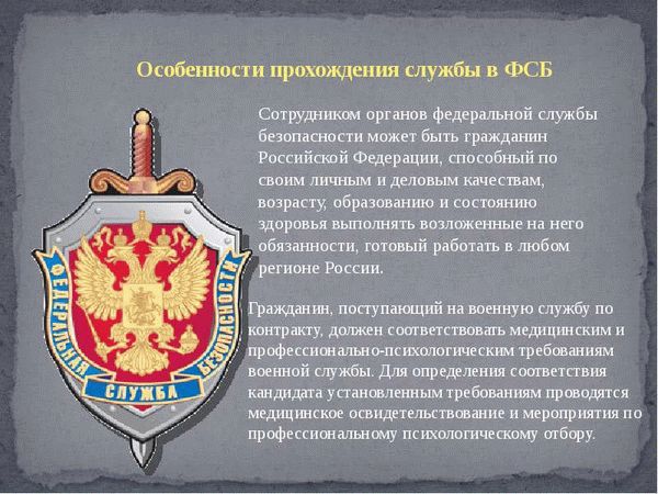 Следовательно, деятельность силовых структур, таких как ФСБ, принадлежит к разряду очень сложных, потому что от них зависят жизни сотен людей, территориальная неприкосновенность государства, поэтому и требования к сотрудникам чрезвычайно высоки, и здесь преимущество имеют служившие в армии юноши. Также важна и психологическая составляющая, потому что приходится справляться со многими эмоциональными и психологическими трудностями, от которых зависит качество работы. Специфика работы предполагает высокий уровень духовно-нравственного воспитания кандидата.
