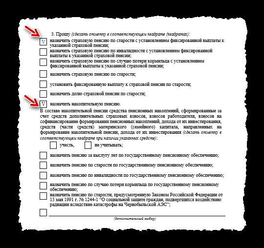 9) Здесь требуется поставить галочку, указывающую, на какой вид пенсионного пособия рассчитывает заявитель. Для предназначения полного пособия желательно отметить 2 окошечка, где прописаны страховые и накопительные пенсии.