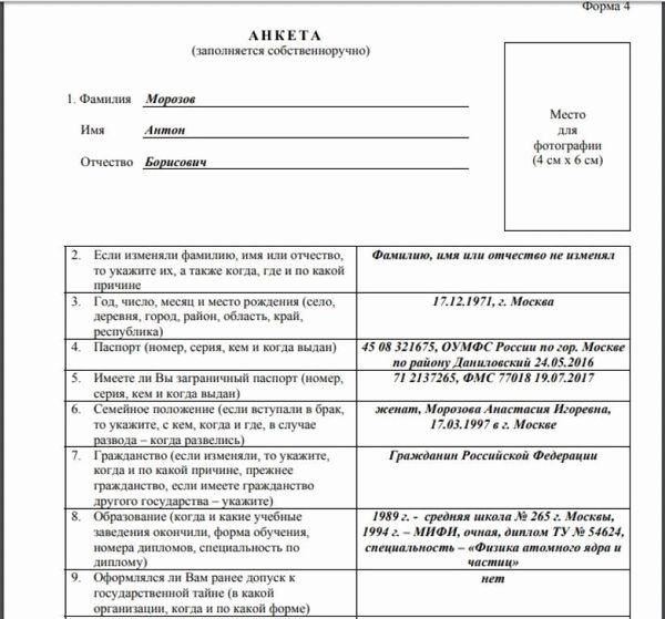 Правительственным постановлением РФ № 63 от 06.02.2010 (ред. от 10.07.2020), утвердившим алгоритм допуска граждан РФ к государственной тайне, предложена анкета (форма 4), не представляющая сложности при ее заполнении.