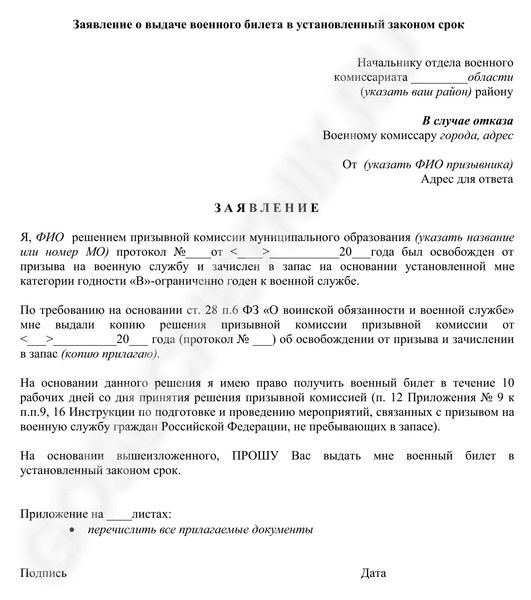 В военкомате нужно оформить заявление на получение военного билета в соответствии с образцом и просьбой о выдаче.