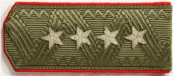 Далее следуют генерал армии – диаметр звезды составляет 40 мм, наравне с ней располагается петличная эмблема Сухопутный войск (звезда в венке). Наивысшее действующее звание – маршал. Наплечные знаки различия включают вышитую сорокамиллиметровую звезду с кантом и герб Российской Федерации (без принятого геральдического щита).
