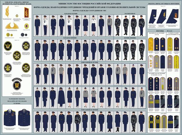 Работники ФСИН обязательно имеют несколько различительных знаков: общие нашивки, которые подходят для всего СИН, и указывающие на конкретное подразделение. Общая эмблема имеет овальную форму. Размещаются они на груди и правом рукаве снаружи.