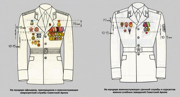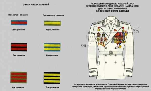 Согласно этому документу, ордена, имеющие форму звезды, крепятся на специальных штифтах на правой стороне кителя или пиджака. Те, что имеют форму круга или овала, — слева на специальных пятиугольных колодках, которые обтянуты лентой соответствующего цвета. Причем каждому ордену или медали соответствует строго определенная ленточка, по цвету которой можно распознать, какая именно награда присвоена человеку, даже в том случае, когда последняя отсутствует.