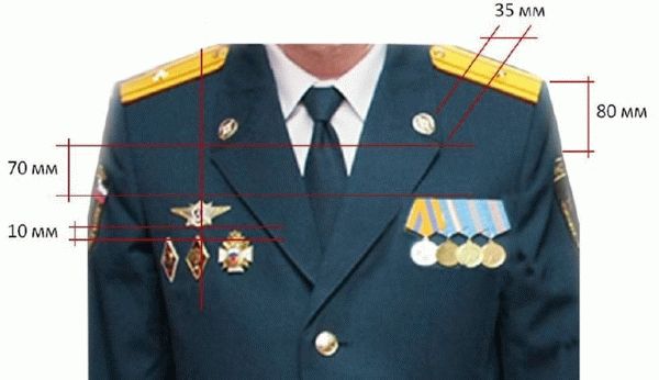 Знаки отличия Вооруженных Сил (кроме медалей Министерства обороны) и иные военно-геральдические знаки располагаются горизонтально в ряд от центра груди к правому краю, при этом в ряду должно быть не более трех (на куртке костюма летнего повседневного — четырех) знаков, расстояние между знаками отличия 10 мм. При ношении военнослужащими знаков отличия Вооруженных Сил (кроме медалей Министерства обороны) и иных военногеральдических знаков меньше максимального количества они располагаются симметрично относительно вертикальной линии, условно проведенной по центру видимой части груди.