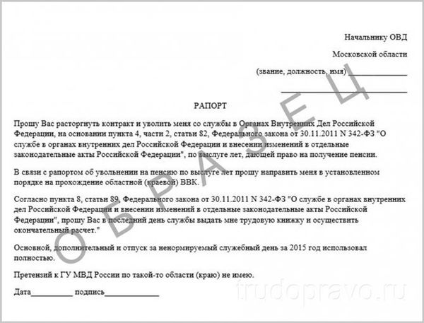Сотрудник ОВД имеет право расторгнуть контракт и уволиться со службы по собственной инициативе до истечения срока действия контракта, подав в установленном порядке рапорт за один месяц до даты увольнения (ч. 1 ст. 84 Федерального закона от 30.11.2011 № 342-ФЗ «О службе в органах внутренних дел Российской Федерации и внесении изменений в отдельные законодательные акты Российской Федерации» далее — Закон № 342-ФЗ).