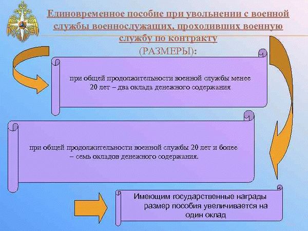 - разовое пособие, на размер которого влияет срок службы. Если гражданин отработал более 20 лет — в размере семи ежемесячных окладов, менее 20 лет — два оклада. Если имеются государственные награды, предусмотрены дополнительные выплаты;